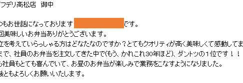 ライフデリ高松店へのお手紙をご紹介します。 「ライフデリ高松店 御中 いつもお世話になっております。 毎回美味しいお弁当ありがとうございます。 献立を考えていらっしゃる方はどなたなのですか?とてもクオリティが高く美味しく…