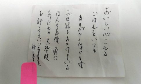 ライフデリ大阪平野・東住吉店へのお手紙をご紹介します。 「おいしい心こもるごはんをいつもありがたく存じます。 お世話をおかけしている ほんの気持、家にあったもの、失礼の段 お許しください。 ご多幸を祈ります。」とのことで…