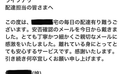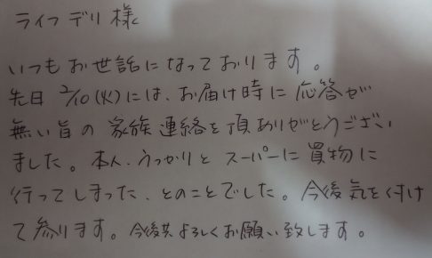ライフデリ横浜川崎店へのお手紙をご紹介します。 「安否確認報告の電話に対し感謝のお言葉をいただきました。」とのことです。 配達時に応答がないことのご連絡をご家族様に差し上げたところ、ただ出かけていたことがご家族様の確認で…